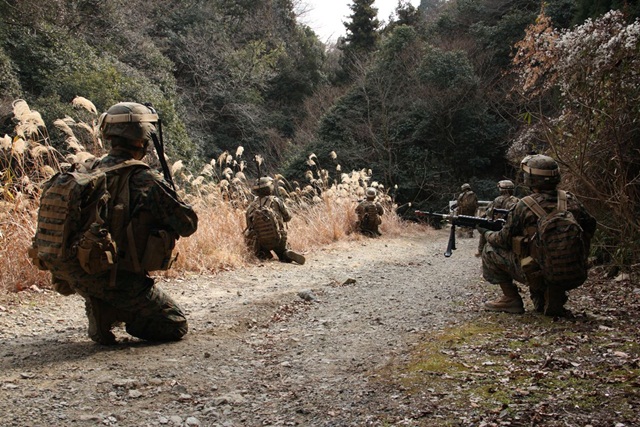 | ジャングル奥地のメイン道路で敵を警戒する海兵隊員 |