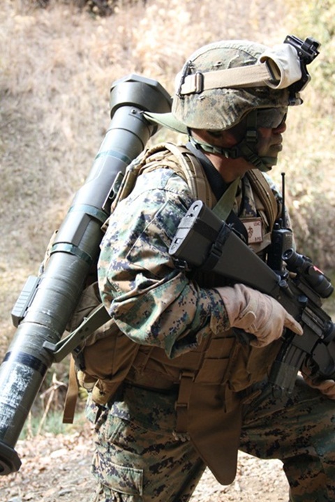 | M136 AT-4 対戦車無反動砲で敵戦車を狙う |